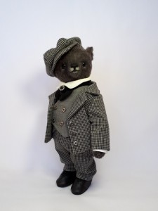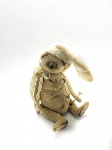 Klassisch deutscher Teddybär, unbekleidet oder bekleidet mit selbst gefertigter Kleidung, mit nur einem weiteren Zubehörartikel wie einem weiteren Bären, einer Puppe, einem Puppenwagen, einem anderen Tier, einem Fahrrad, Auto, Stuhl etc.