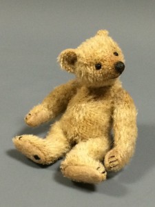 Miniature bear up to 10 centimeters, dressed or undressed with accessories such as a further bear, doll, doll’s pram, another animal, bike, car, chair etc.