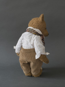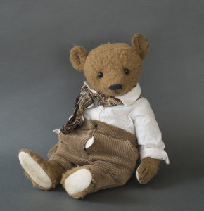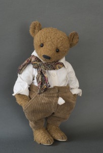 Creative interpretation of one single teddy bear, mainly made of fabric, dressed with handmade clothes, with a maximum of three additional items such as another bear, animal, doll, doll’s pram, bike, car, chair etc.